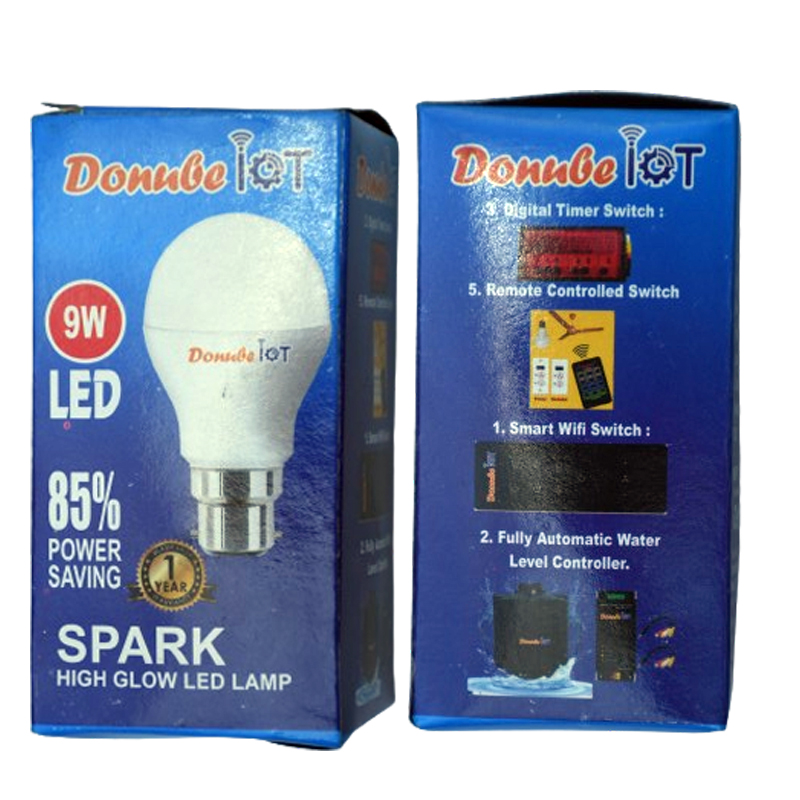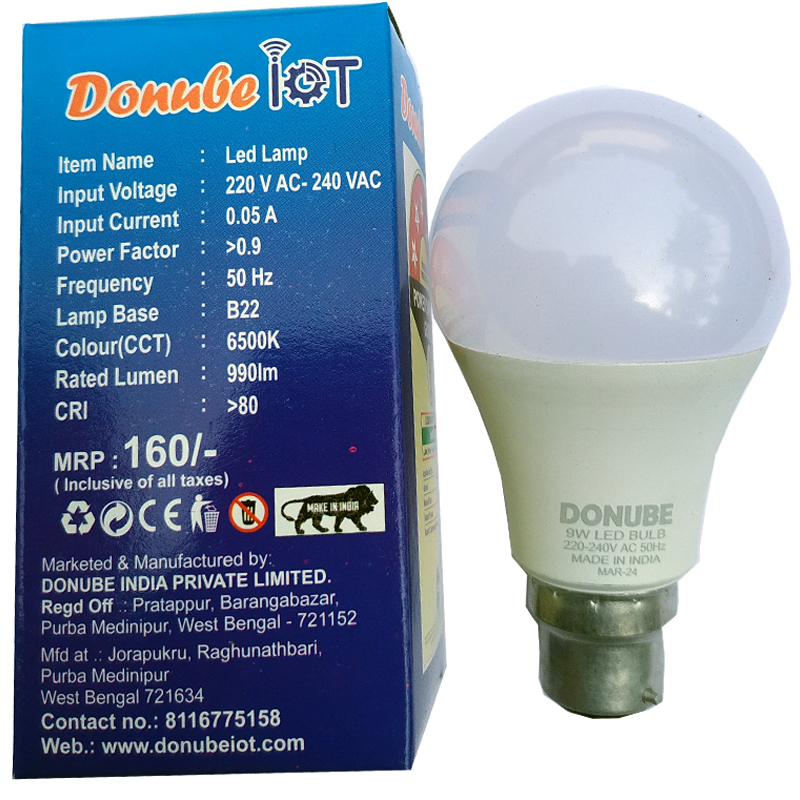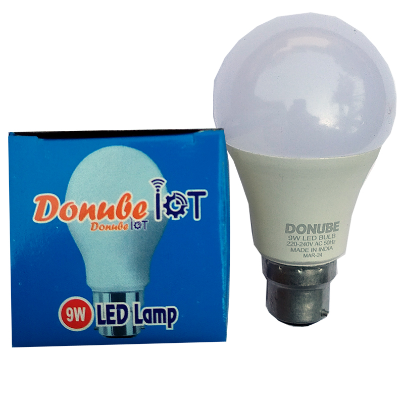Donube IoT 9W High Glow LED bulb, 180-degree wide beam angle, Voltage surge protection up to 4 kV, 6500K, Cool White. B22d base. Made in India, Pack of 1